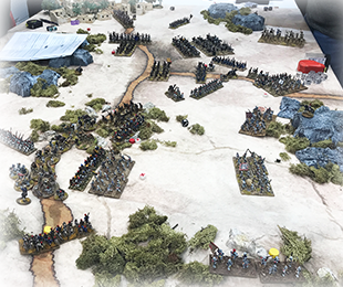 We had not played Battles For Empire in quite some time, so it was back to the desert! An Egyptian column has been sent out to arrest the provincial governor, who is in a village deep in rebel territory. The column also has supplies for the garrison. The column had Sudanese, Egyptian cavalry, Bashi-Bazouks, slavers, and plenty of baggage, plus two sections of mountain guns. The advance party finds that the governor and garrison have gone over to the Mahdi and the trap is sprung! What followed was a highly chaotic and desperate battle that went for almost 3 1/2 hours! The game featured a number of cavalry charges, counterattacks, desperate defense of the baggage, then trying to get back through the pass and to safety.
