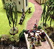 There were a series of charges, melees, then multiple shooting at each other type rounds that bloodied both forces quickly. On the other side of the board both sides were having difficulty moving up as the terrain precluded any wide deployments and the bridge produced a bottleneck. After a few turns, however, both sides came to grips with each other in a series of deadly hand to hand battles. After a seesaw struggle with the Welsh, the Vikings were severely depleted and the Normans were already in bad shape. In the end the game was called as a Teutonic/Welsh victory as the Normans and Vikings ran out of gas and had taken too many losses. For our first time the game went pretty well and after a few turns everyone figured out the system. It would be interesting to see this game played with larger forces and hsitorical opponents, plus I would like to see it tried with other periods.