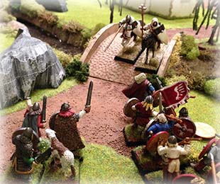 Saga is a Dark Ages skirmish system that can be used for a wide variety of periods. Forces are broken up into units of anywhere from 4-12 figures, which have different stats depending upon troop type. Each turn a player rolls a handful of order dice depending upon the number of units, which are then set out in various combinations on a roster card that dictates which units will move along with their special abilities for that turn. Each army has various abilities such as improving melee dice, re-rolling, sacrificing casualties for extra die rolls, etc., which makes it very challenging for players to choose the right combination each turn. Melee and shooting are done with a series of die rolls along with saves, which is quick and pretty deadly. There are several supplements to the rules and plenty of ideas for adapting them to other periods.