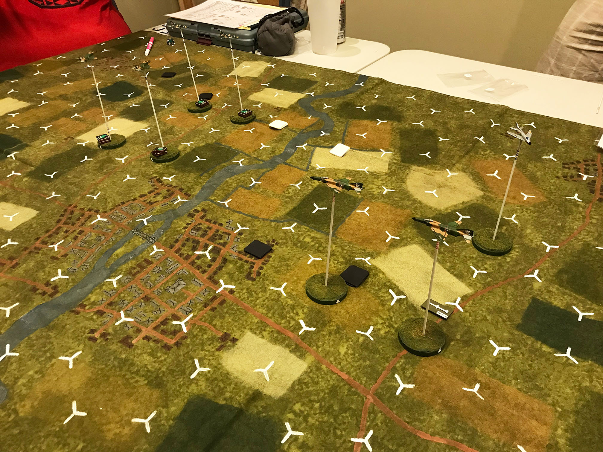 Back to the skies over North Vietnam and this time it would be F-4Cs going up against Mig-21s and Mig-19s. This was going to be difficult from the start as not only were the Migs facing F-4s, I had to run all four Migs plus the game charts! It's always hard to impose rules of engagement on the F-4s as they are very powerful in the game, but we used the sighting rules and stipulated they couldn't fire until all targets were visually identified. The F-4s easily got radar locks on alll four MIgs, but had a tough time getting visual I.D. until they closed the range. That didn't stop the first pair of F-4s from launching a volley of AIM-7s that obliterated a Mig-19 from the sky and all of a sudden it was 4 against 3! The F-4s and the Migs danced around for several turns, with the Migs dodging a few cannon shots as well as more Sparrows.