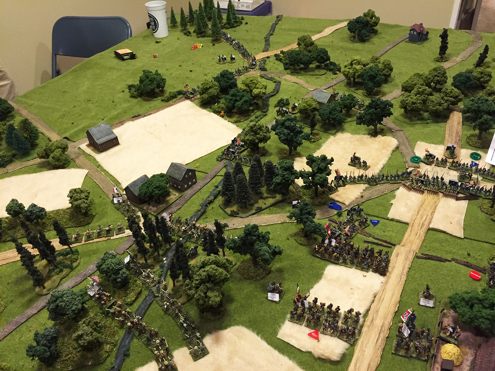 After another turn or so it was apparent that the Union was not going to be able to retake either crossroads so the game was declared a CSA victory, albeit just barely. This was a close fought battle with some heavy casualties on both sides. The terrain was pretty difficult to move through with very limited fields of fire and playing with a lot of green forces was definitely a challenge! The Union forces had a few die rolls that failed at the wrong time or the game could easily have gone the other way. The Fire & Fury rules do a great job of simulating the to and fro of ACW fighting, giving both sides multiple chances for victory.