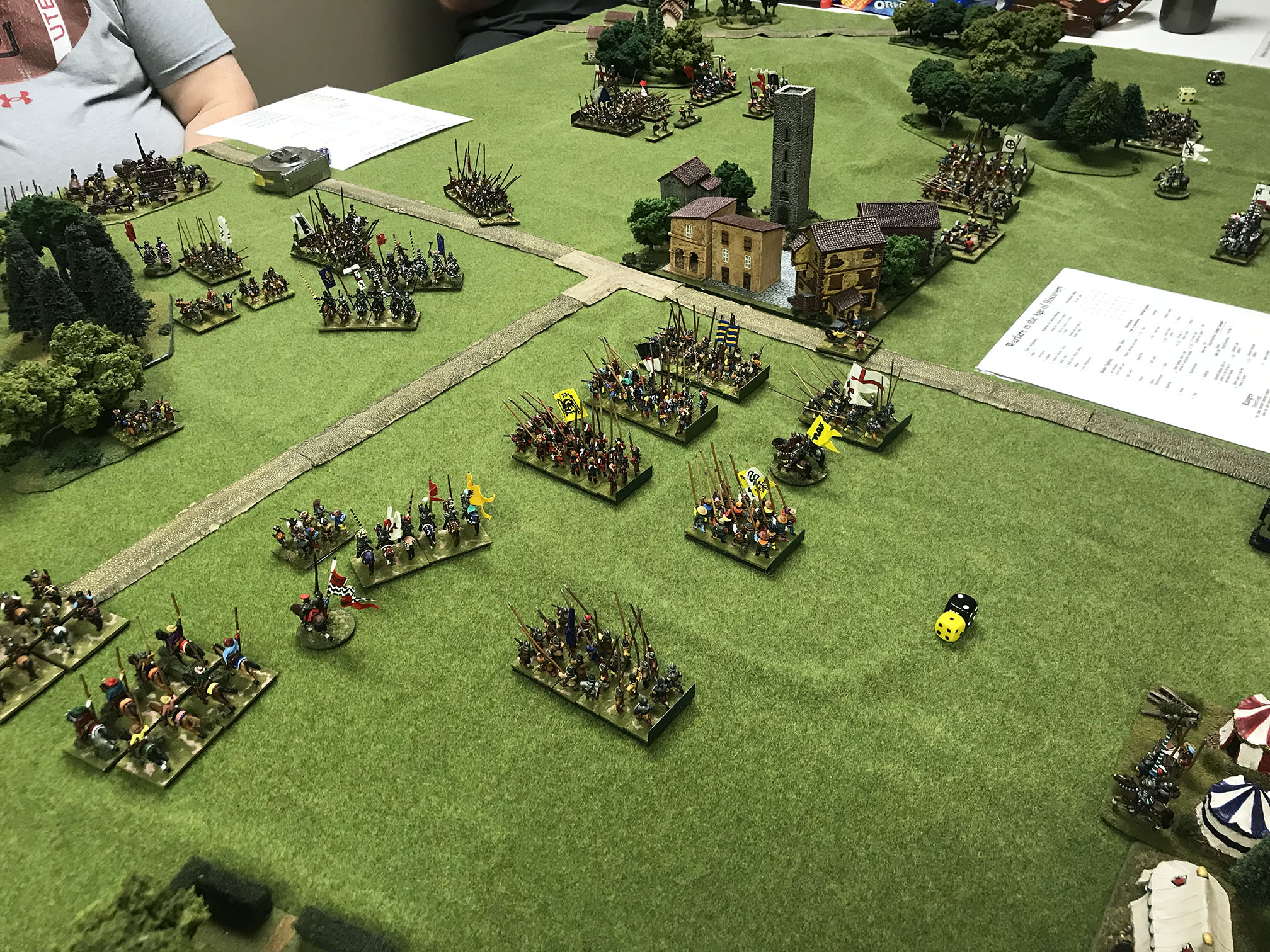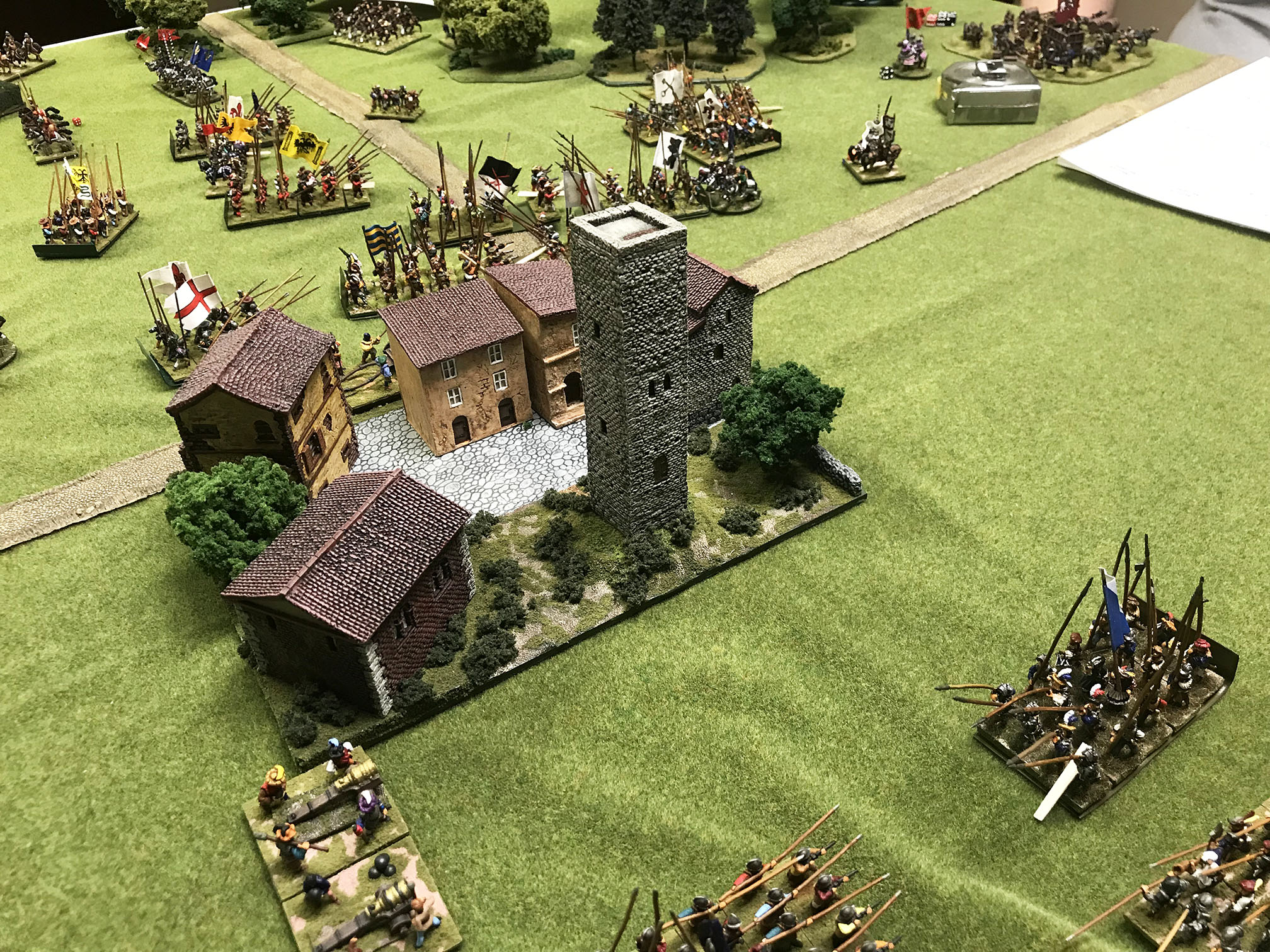 Hard to imagine, but we had not played a Renaissance game in quite some time! With Covid, time seems to have passed much more quickly than we thought, so it was time to get back to this interesting period with a 1525 era French vs. Imperialists clash. This was an unusual battlefield in that the town was right in the center, which made everyone change their deployments and turned into almost two separate battles; one on each side of the town! The Swiss and German pike moved out towards their inevitiable clash, while on the flanks the cavalry and light troops started some interesting fights. All of these troops had low morale grades, so by the third or fourth turn, half of them had fled! In the center there were some huge pike battles which were bloody as always, while on the other side of the town the Spanish were taking it to the Swiss, which was unexpected.