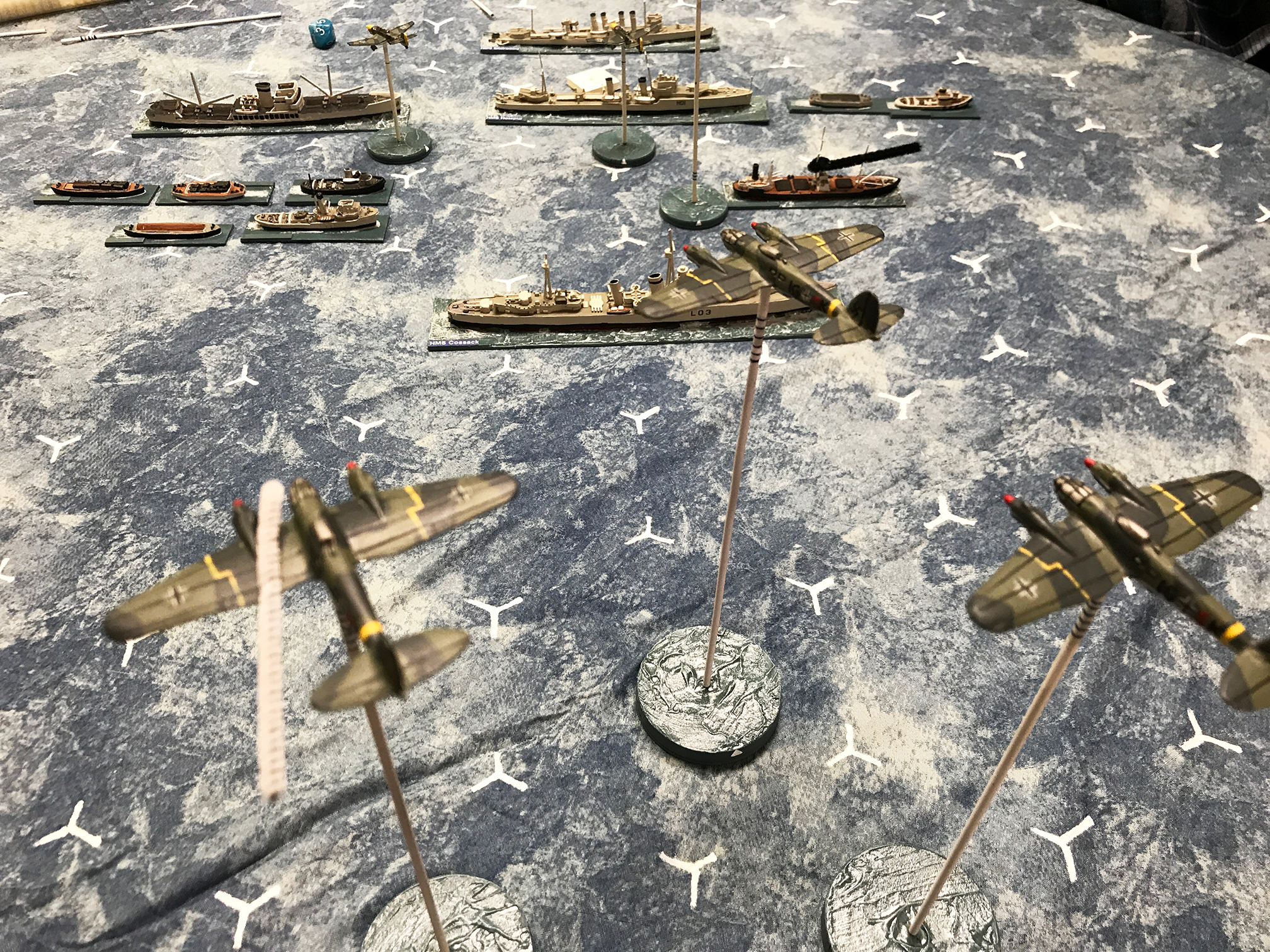 One Spitfire that had emerged from the other melee dove on tthe JU-87s and although scoring a few hits, was miraculously shot down by the Stukas! Both sides scored a lot of hits on each other, but nothing serious enough to actually shoot down an aircraft. The exception was the naval flak, which took out three German aircraft. In the end, two freighters were sunk, one escort damaged, five German aircraft shot down, and several damaged for the loss of one Spitfire, although the remaining Spitfires and Hurricanes all had damage. It was a great battle that worked out well and we finished in about 4 hours, which was pretty good.