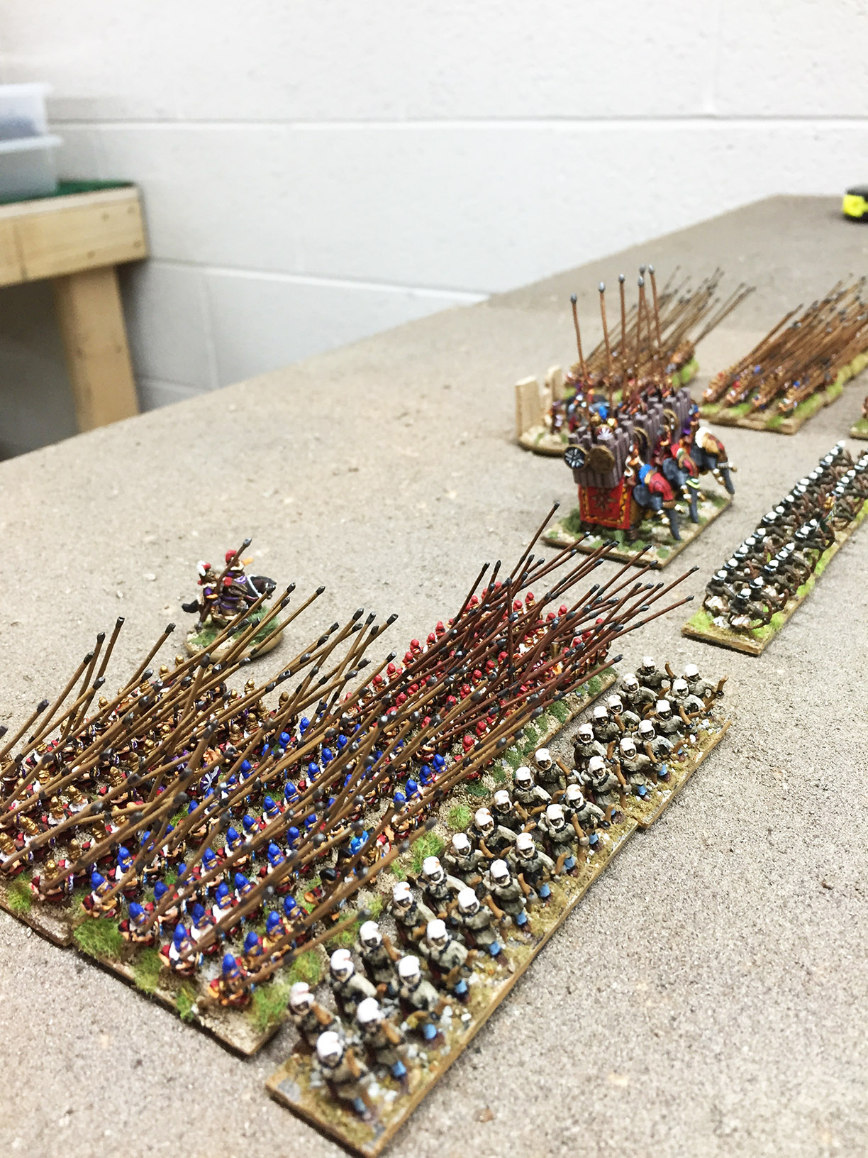 With a large number of pike units, Thorakites, Imitation Romans, and lots of cavalry, it was a pretty formidable force. both sides moved out pretty fast, except for the Indian center, which essentially stayed in place almost the entire game! The Seleucid right became a death trap, with both sides throwing in units with reckless abandon and after several turns the forces on that flanked were wrecked. The Seleucid right ended as a stalemate while in the center both sides had their elephants cause some major damage before they were eliminated. The game went right down to the wire, with the Seleucids causing the last few stand losses that pushed the Indians over their break point and the game ended as a Seleucid victory. These are two evenly matched forces with completely different fighting styles.