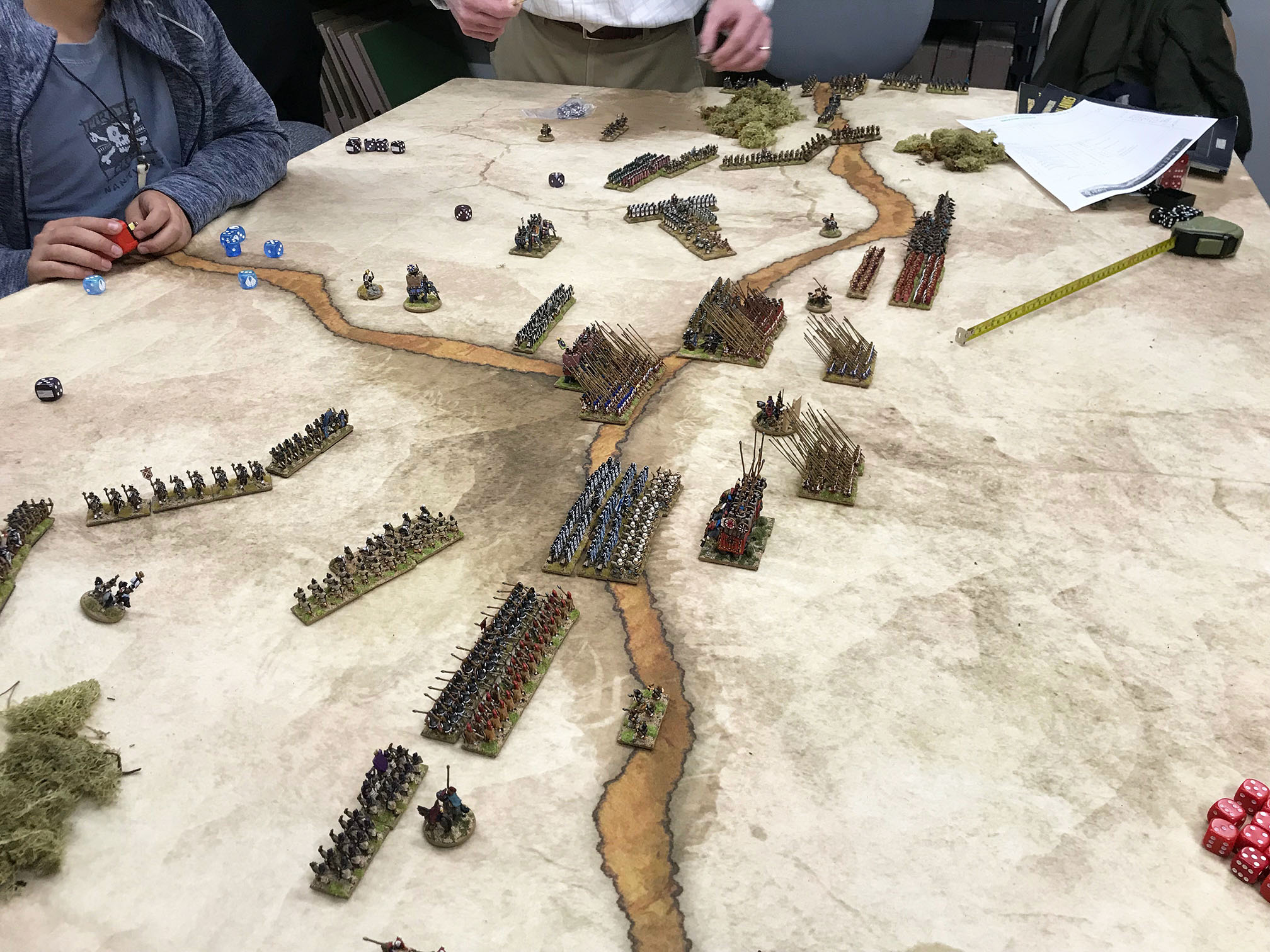 Successors vs. Indians is always a fun battle because the amountof Indian units on the board in a 2000 points per side game is staggering! You have 20 infantry and archer units alone, then you add skirmishers, elephants, cavalry, etc., and it is quite the horde. In fact, they have a break point of 14, which is pretty hard to reach in a game, which means you need to grind them down and hope you don't suffer a few reverses yourself. In this game the Successors did well at the start, but could never quite get their heavy troops to charge all at the same time. Instead, there were a series of running fights across the board where the Indian numbers eventually overwhelmed the units facing them.