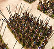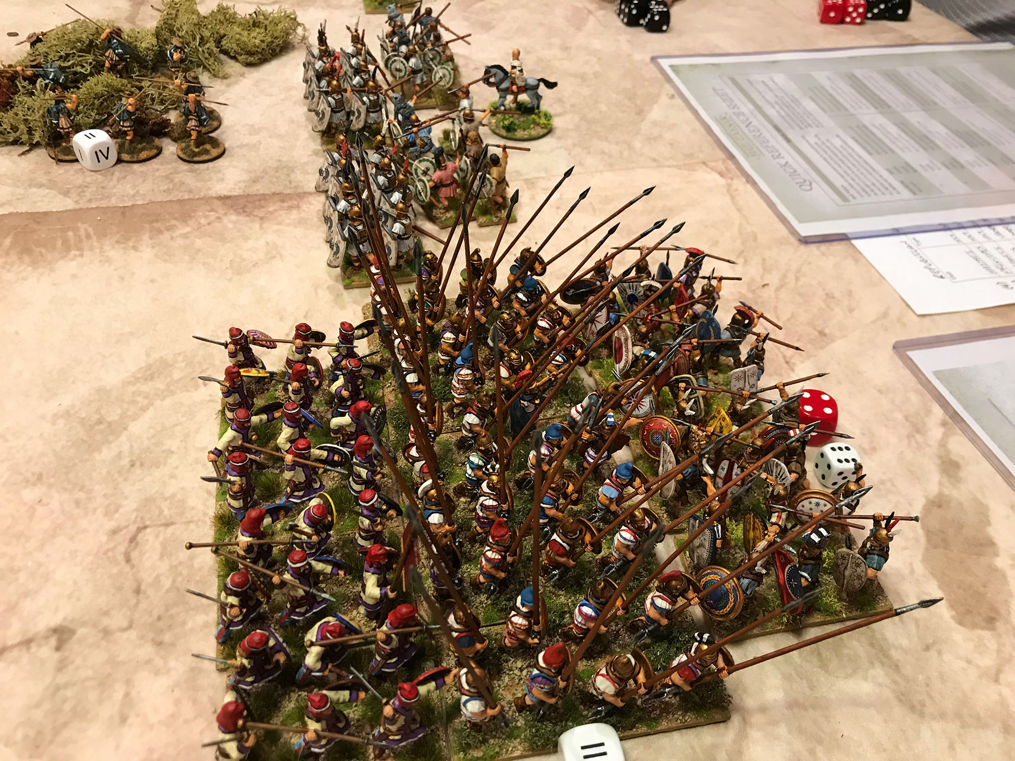 Despite Hail Caesar being out for quite some time now, this would be our first try at the rules. We never really had any armies based for the period, but now with two 28mm forces available, it was time to give it a try. Not really knowing what to do in terms of army lists, command ratings, optional rules, etc., we went with a pretty standard set up as well as units. There would be two legions plus cavalry going up against a traveling circus of pikes, elephants, Persians, Red Sea Arabs, cataphracts, and more. It took us a few turns to figure out the command system, shooting, break tests, etc., but then the action really got going. The Successors were certainly the agressors, moving out quickly and pressing the attack.