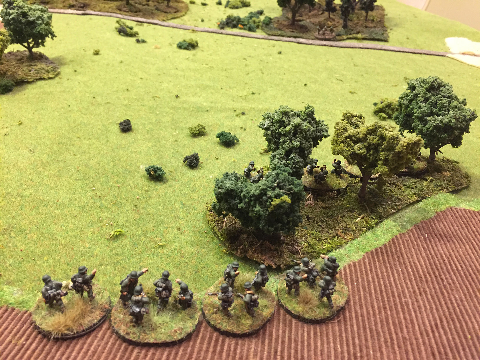 With only a few of us and getting a late start, this would turn out to be a two night battle where we only had one short night! The scenario was a German attack to seize a hill overlooking a village while at the same time clearing the entire road. The Germans had three companies of infantry with mortars, limited armor support, and some off board artillery. The Russians were entrenched in the tree lines and village, with some T-34s hidden near the hill. The Germans had a very successful opening barrage and made steady progress towards the village and the road. That's where the opposition started and it got heavier as the Germans advanced.
