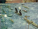 The aircraft you see in the images are a mix of 1/285th and 1/300th from GHQ, CinC, Scotia, and Ros-Heroics/Navwar. The B-17s are die-cast toys sold through various sites. The ships are 1/600th kits from the old Airfix line plus some from the coastal series by Skytrex. Mats are fabirc with the hex corners painted in by hand with acrylic paint. We use five inch hexes as you sometimes need to have multiple aircraft in the same hex. Future plans are to make some winter hex mats, a Pacific island mat, and a desert mat for WW2 actions in North Africa and it can also be used dual purpose for Arab-Israeli Wars or Persian Gulf scenarios with the Phantoms rules where necessary.