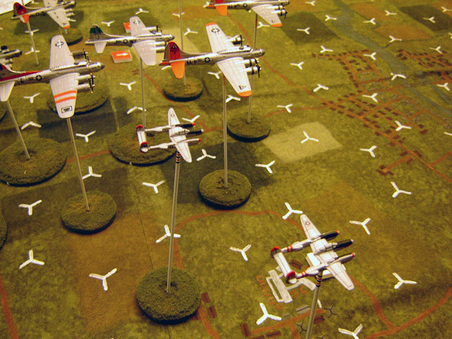 Most of our group at one time or another has been involved with air combat gaming. From the early days in the 70s playing Richtofen's War or Blue Max to Mustangs today, air combat has always been one of our most popular periods to game. Many of us started out with boardgames, moved to 1/72nd scale aircraft, then finally to 1/300th miniatures for our games. Along the way we've found what works, what we don't like to play, and how to run large group games with a lot of aircraft on the table. At this time we have enough aircraft to do German raids in 1940 either over the English Channel or England itself, bomber raids deep into Germany in 1945, fighter sweeps, and are working on other theaters for the future.